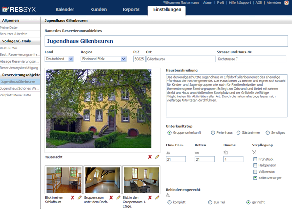 - Max. Pers, Betten, Räume: Geben Sie eine maximale Personenzahl sowie die Anzahl der Betten und der Räume ein. Dies ist wichtig, damit das Objekt nicht überbelegt werden kann. RESSYX warnt Sie bei einer Überbelegung. Geben Sie auch an, wie behindertengerecht Ihr Reservierungsobjekt ist.