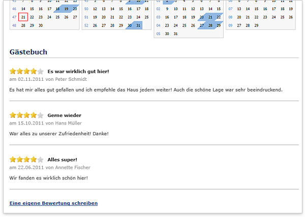 Wenn Sie in den Ressyx-Einstellungen die Funktion "Gästebuch" aktiviert haben, können Ihre Gäste auf hausbuchen.de eine Bewertung zu einem Ferienobjekt schreiben. Diese wird dann in Ihrem persönlichen Gästebuch veröffentlicht.