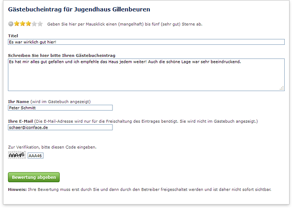 Zuerst klickt der Kunde auf den blauen Link "Eine eigene Bewertung schreiben" und kann in dem untenstehenden Fenster seinen Eintrag schreiben. Nach Klick auf den Button "Bewertung abgeben" bekommt der Kunde eine E-Mail und muss diese bestätigen.