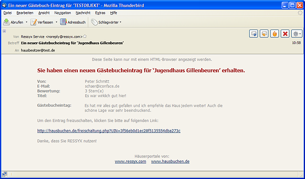 Nun müssen Sie die Bewertung, die der Kunde geschrieben hat freischalten, indem Sie auf den blauen Link in der Email klicken und schon erscheint sie auf hausbuchen.de in Ihrem Gästebuch.